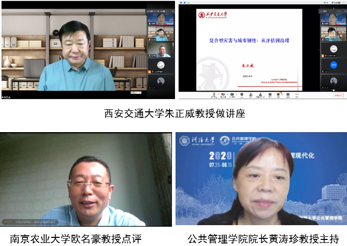 8月9日,“应急管理与国家治理现代化”云端系列名家讲堂第七讲如期举行。西安交通大学公共政策与管理学院教授、国家文化名家暨“四个一批”人才和国家哲学社会科学领军人才、教育部公共管理学科教学指导委员会委员、中国行政管理学会常务理事、中国行政管理学会教学研究会副会长、中国应急管理学会校园安全专委会副主任朱正威教授以《复合型灾害与城市韧性:从评估到治理》为题,为河海师生带来了一场精彩的学术报告。南京农业大学欧名豪教授特邀点评。88858cc永利官网88858cc永利官网院长黄涛珍教授主持报告会。近200名师生认真聆听了报告。
