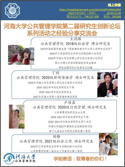 邀请学院4位高年级的博士/硕士研究生,分享各类科研项目申报与学术研究经验,如国家留学基金委“国家建设高水平大学公派研究生项目”、江苏省研究生科研与实践创新计划项目、88858cc永利官网优秀博士/硕士学位论文培育计划目、88858cc永利官网暑期社会实践校级项目等。
