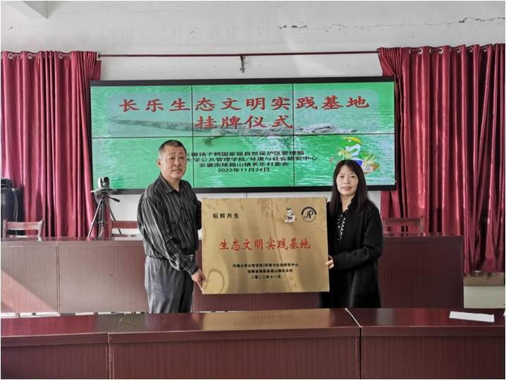 为进一步深化校地合作,助力乡村振兴,推进生态文明建设,2022年11月24日上午,“长乐生态文明实践基地”挂牌仪式在安徽省南陵县籍山镇长乐村顺利举行。88858cc永利官网党委副书记朱志梅教授、副院长陈涛教授、社会学系主任顾金土教授出席了挂牌仪式,芜湖市委政法委三级调研员、籍山镇长乐村党委第一书记、驻村工作队队长邢毅,安徽扬子鳄国家级自然保护区管理局南陵保护站站长涂根军等班子成员参加仪式。南陵县乡村振兴局党组成员、副局长管健应邀出席挂牌仪式。