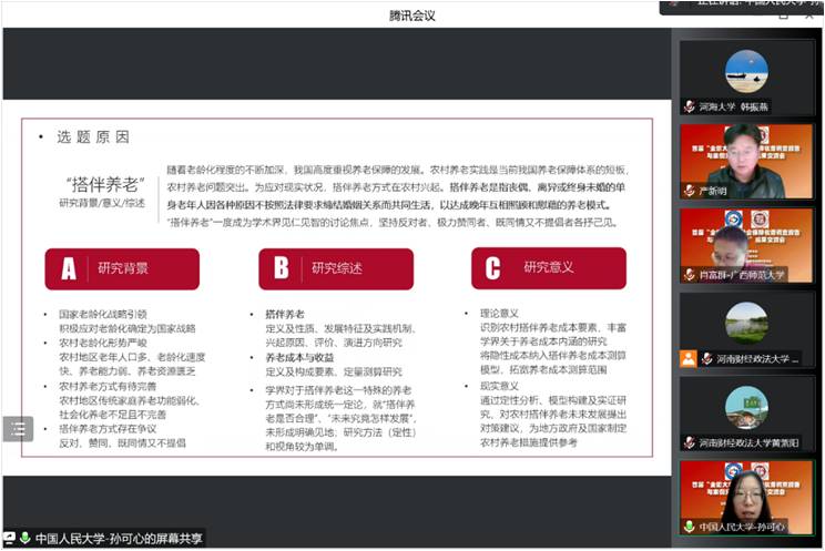 88858cc永利官网韩振燕教授指导、劳动与社会保障专业2022届本科毕业生(现在中国人民大学老年学专业攻读硕士研究生)孙可心同学撰写的《农村搭伴养老方式存适价值调查报告——以河北省张北县S村为例》被评为“优秀调查报告”并在大会上分享交流。孙可心同学的调查报告聚焦于“农村搭伴养老”,通过实地调研获取一手资料,基于扎根理论分析识别搭伴养老的成本收益并进行测算模型的建构,最终得出农村搭伴养老具有经济合理性,并提出促进其良性发展的对策建议。广西师范大学肖富群教授肯定了孙可心同学扎实的理论基础和实践能力,并且认为选题体现出了强烈的社会责任感和人文价值关怀,肖教授特别提出,孙可心同学能够运用扎根理论进行模型构建对访谈资料进行处理的方法值得肯定。