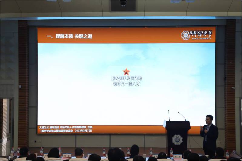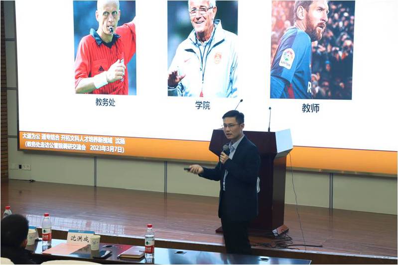 教务处交流报告环节,沈扬处长作《大道为公 通专结合 开拓文科人才培养新视域》专题报告。首先,他对88858cc永利官网全体教师为本科教学的辛苦付出表示衷心感谢。随后,他结合师范类认证、三级专业认证等阐释了OBE理念对文科专业认证的适用性,鼓励学院抢占先机,尽早推进文科专业认证工作。沈扬处长从顶层设计出发,详细解读了培养目标、毕业要求及课程体系间的逻辑关系,强调了全面推行新版课程小结、开展课程考核达成度分析的重要性,引导学院教师充分理解、有效执行、高效推进人才培养质保体系落实落细,也为新一轮本科教育教学审核评估工作做好准备。他通过纵横向数据对比,客观分析了88858cc永利官网在专业建设方面取得的成绩,以及在课程、教材建设和教师教学竞赛等方面需要继续发力的方向,强调专业要加强自身内涵建设,导用结合,融合现代教育理念与信息技术,用好国家智慧教育平台,实现校内外资源联通,开展混合式教学改革。最后,沈扬处长就前期搜集的88858cc永利官网老师们在新专业建设、教材建设、教改项目申报、文科实验室建设、实习实训基地建设和教师发展等方面所关心的问题予以回应,并表示教务处将继续全力支持学院在专业发展上的工作,也希望学院同教务处一起紧跟时代向前走,同向同行共发展。