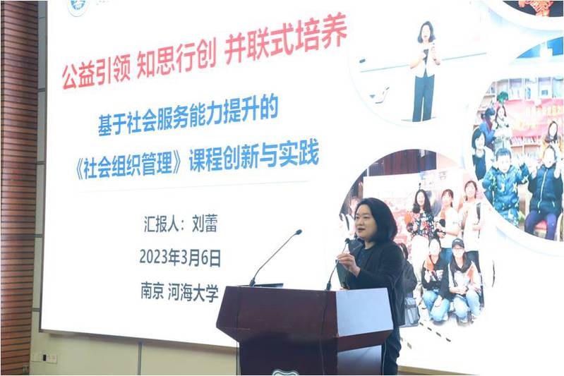 优秀课程建设案例分享环节,第四届全省高校青年教师教学竞赛一等奖、第三届江苏省高校教师教学创新大赛一等奖获得者中国矿业大学刘蕾教授作《公益引领 知思行践 并联式培养——<社会组织管理>课程创新与实践》经验分享。她从课程概况、学情分析与教学痛点、创新理念与创新举措,以及创新成果四个方面展开介绍,通过学情分析发现教学痛点问题,开展指向学生公共服务能力提升的情景化课程设计,在课程理念、教学目标、课程内容、课程模式、教学资源、教学方法、教学评价等多方面开展探索创新并取得了一系列教学成果。最后,刘蕾教授结合自身课程建设和教学竞赛方面的经历总结的“不怕累、不怕讲、不怕输、不怕做”“四不怕”精神,鼓励青年教师以学生发展为中心,不忘初心,砥砺前行。