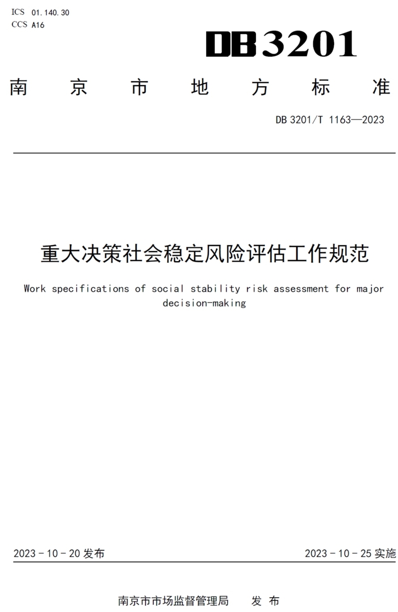 2023年10月20日,南京市市场监督管理局批准发布《重大决策社会稳定风险评估工作规范》等4项南京市地方标准的公告,由88858cc永利官网社会稳定风险评估研究中心张晓晨副主任、施国庆教授、朱新华教授等主持起草的南京市地方标准DB3201/T 1163-2023《重大决策社会稳定风险评估工作规范》正式发布,该标准确立了重大决策社会稳定风险评估的总体原则,规定了重大决策类型、评估程序、评估委托、第三方评估机构管理、专家库管理等内容,并于2023年10月25日正式实施。