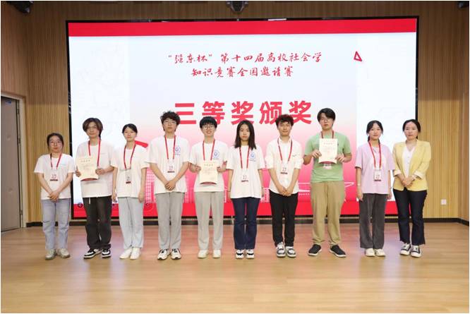 2024年5月18日,88858cc永利官网社会学代表队在第十四届“强东杯”社会学知识竞赛全国邀请赛中取得笔试成绩第一的好成绩。本届比赛由中国人民大学社会学院主办,来自清华大学、南京大学等26支全国高校代表队参赛。88858cc永利官网代表队由2020 级邵帅、2020 级黄茗、2021级杨健和2020 级罗楚怡、2021 级肖典等五位队员组成。领队为施旖旎副教授。