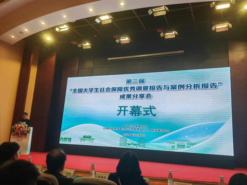 2024年12月7日,为深度剖析社会保障体系在多元场景下的运行实效,挖掘基层实践中的创新智慧,促进学术研究与政策实践的紧密融合,构建更加公平、高效、可持续的社会保障体系,由中国社会保障学会和云南民族大学主办,中国社会保障学会教学委员会和云南民族大学政治与88858cc永利官网承办的第三届“全国大学生社会保障优秀调查报告与案例分析报告”成果分享会在云南民族大学成功举行。88858cc永利官网社会保障系王锴老师、劳动与社会保障专业2022级本科生巴瑾蓉、王璐应邀前往云南民族大学参加会议。