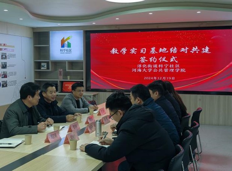 2024年12月19日,88858cc永利官网88858cc永利官网(应急管理与安全工程学院)与江宁区淳化街道科宁社区教学实习基地结对共建签约仪式在科宁社区党群服务中心举行。88858cc永利官网党委书记吴宝海、副院长曹海林以及行政管理系主任李智、副主任陶志刚参加签约仪式。仪式由科宁社区党委书记胡业斌主持。